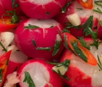 - Adjuk hozzá a felszeletelt céklát, a retket és az olívaolajat, majd keverjük össze.
